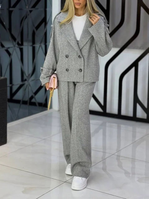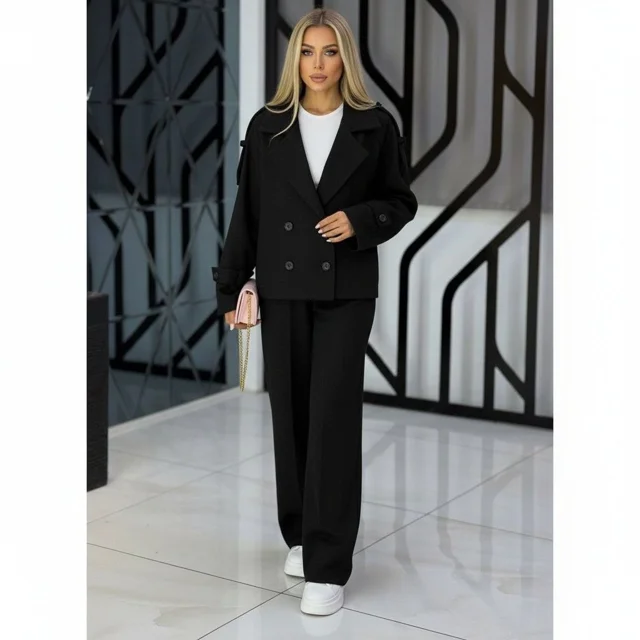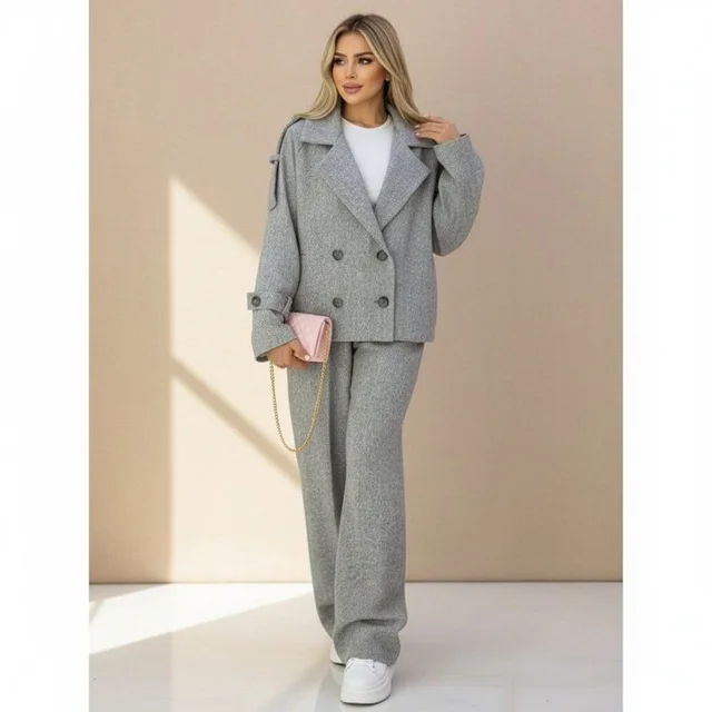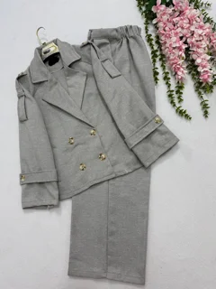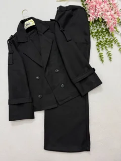 مانتو و شلوار از جنس توییت جناغی با رنگهای طوسی و مشکی، در دو سایز یک (38تا42) و دو (44تا48). قد مانتو 63، قد شلوار 105، دور ران سایز یک 70 و سایز دو 76، قد آستین 70، دور سینه سایز یک 104 و سایز دو 108.